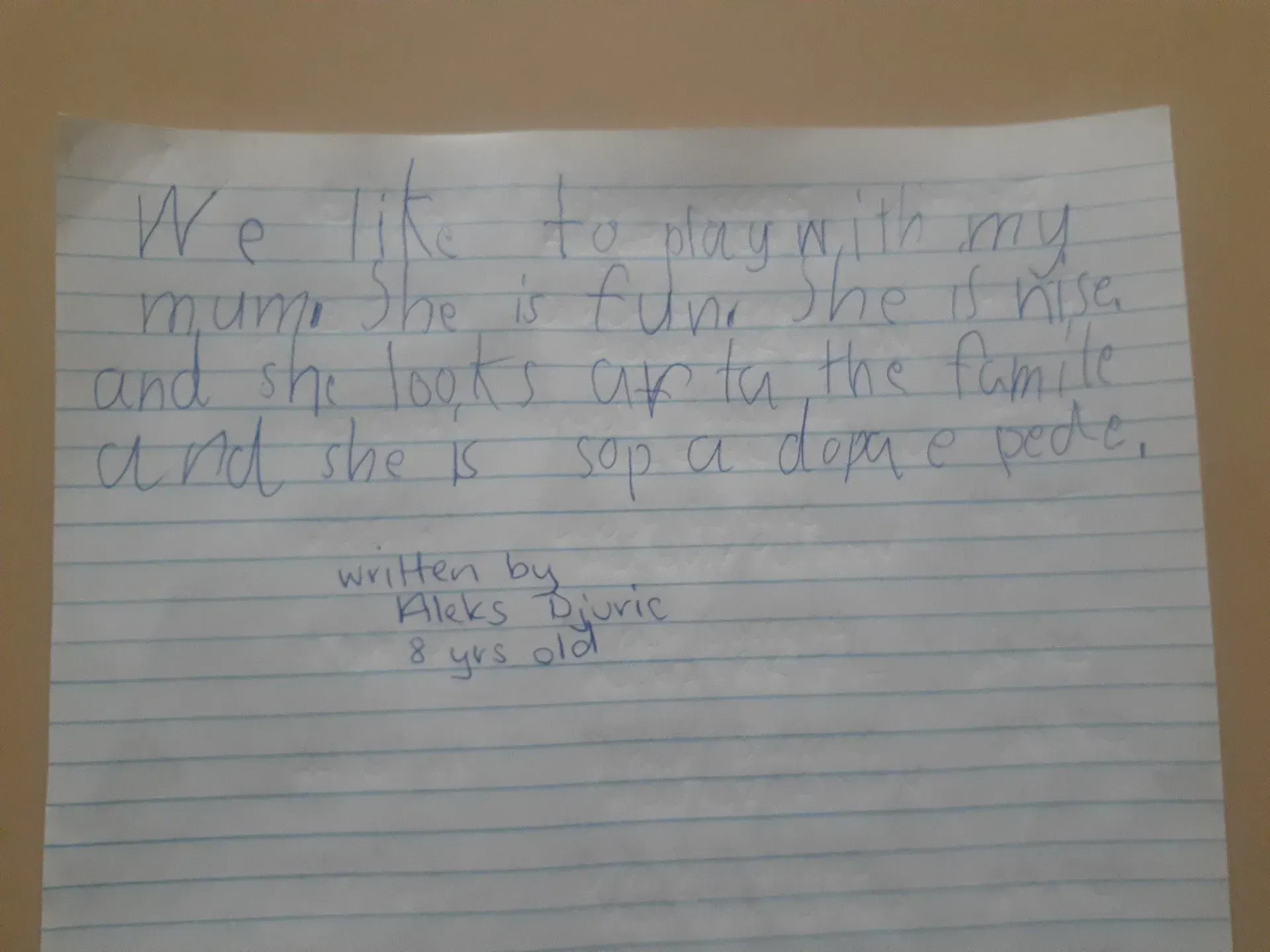 We like to play with my mum. She is fun. She is nice and she looks after the family and she is super dooper.