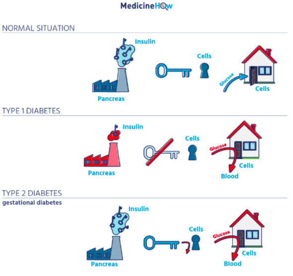 Think about how we get into a house - a factory produces keys, these keys go in the lock of the door, which allows the door to open, and then we can go inside. As you can see in the image below, what normally happens inside our body when we eat food is our pancreas (the factory) releases insulin (the key) into our blood. Insulin attaches to its receptor on the cell (the lock of a door). Insulin unlocks the receptor, which allows sugar (people) to enter the cell (the house).
